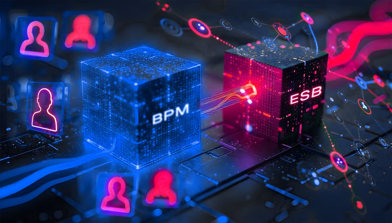 BPM содержит в себе длительную логику по шагам конкретного процесса, в том числе с участием человека. Интеграционный слой ESB, в свою очередь, обеспечивает выполнение каждого шага с большой скоростью и с подключением к разным внешним системам через адаптеры.